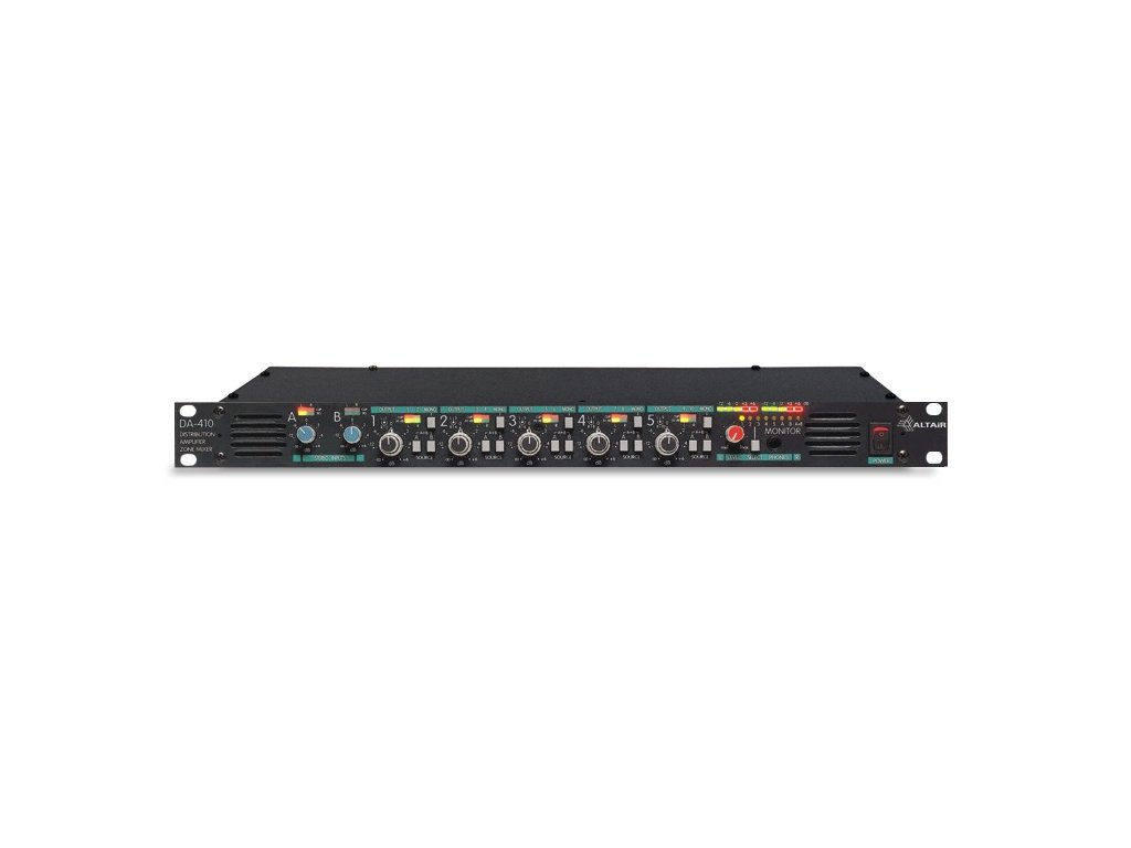 Altair DA-410 je profesionálny distribučný zosilňovač a zone mixer, ktorý umožňuje spracovať až 2 stereo vstupy → 5 stereo výstupov (alebo až 10 mono výstupov). Vďaka flexibilnej konfigurácii môže pracovať aj ako aktívny mic/line splitter (4×8 alebo 1×10). Je ideálnym riešením pre distribúciu signálu v tlačových centrách, nahrávacích jednotkách, broadcast produkcii či audio postprodukcii.