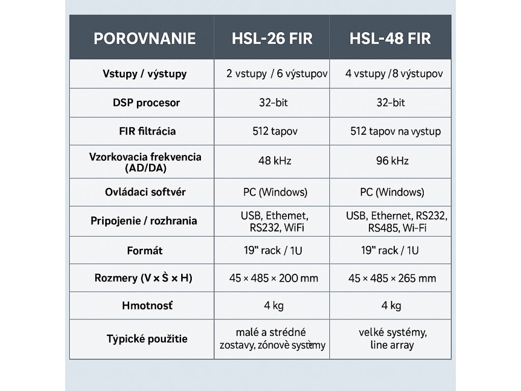 HSL-48 FIR je profesionálny digitálny procesor so 4 vstupmi a 8 výstupmi, navrhnutý pre vysokonáročné ozvučovacie aplikácie. Vďaka 32-bit DSP, 512-tapovým FIR filtrom, 96 kHz vzorkovaniu a množstvu komunikačných rozhraní (vrátane USB, Ethernet, RS232, RS485 a Wi-Fi) ponúka absolútnu flexibilitu pre živé aj inštalačné prostredia.